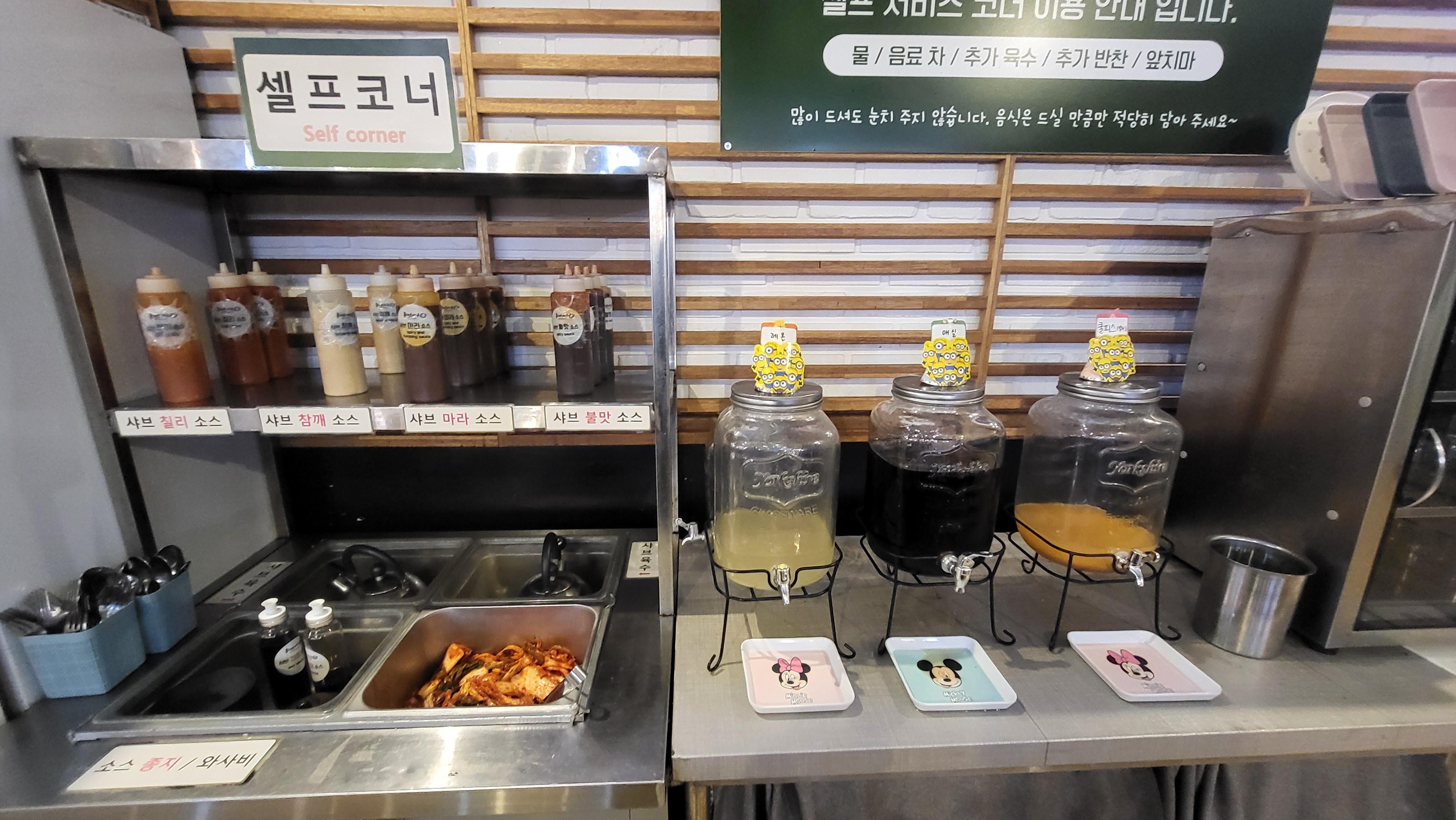 요렇게 각종 소스류, 육수, 김치, 음료가 준비되어 있구요~